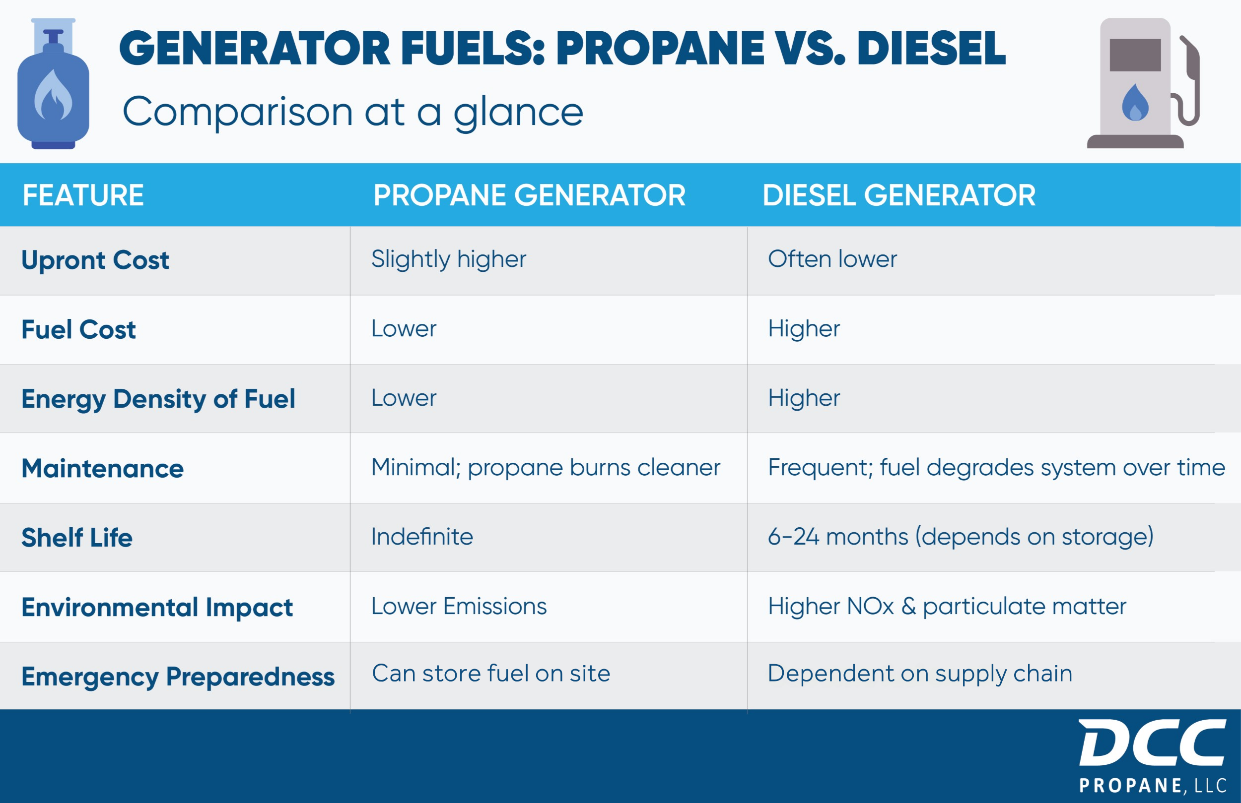 • Diesel fuel degrades over time and must be replaced or treated, whereas propane does not deplete or expire